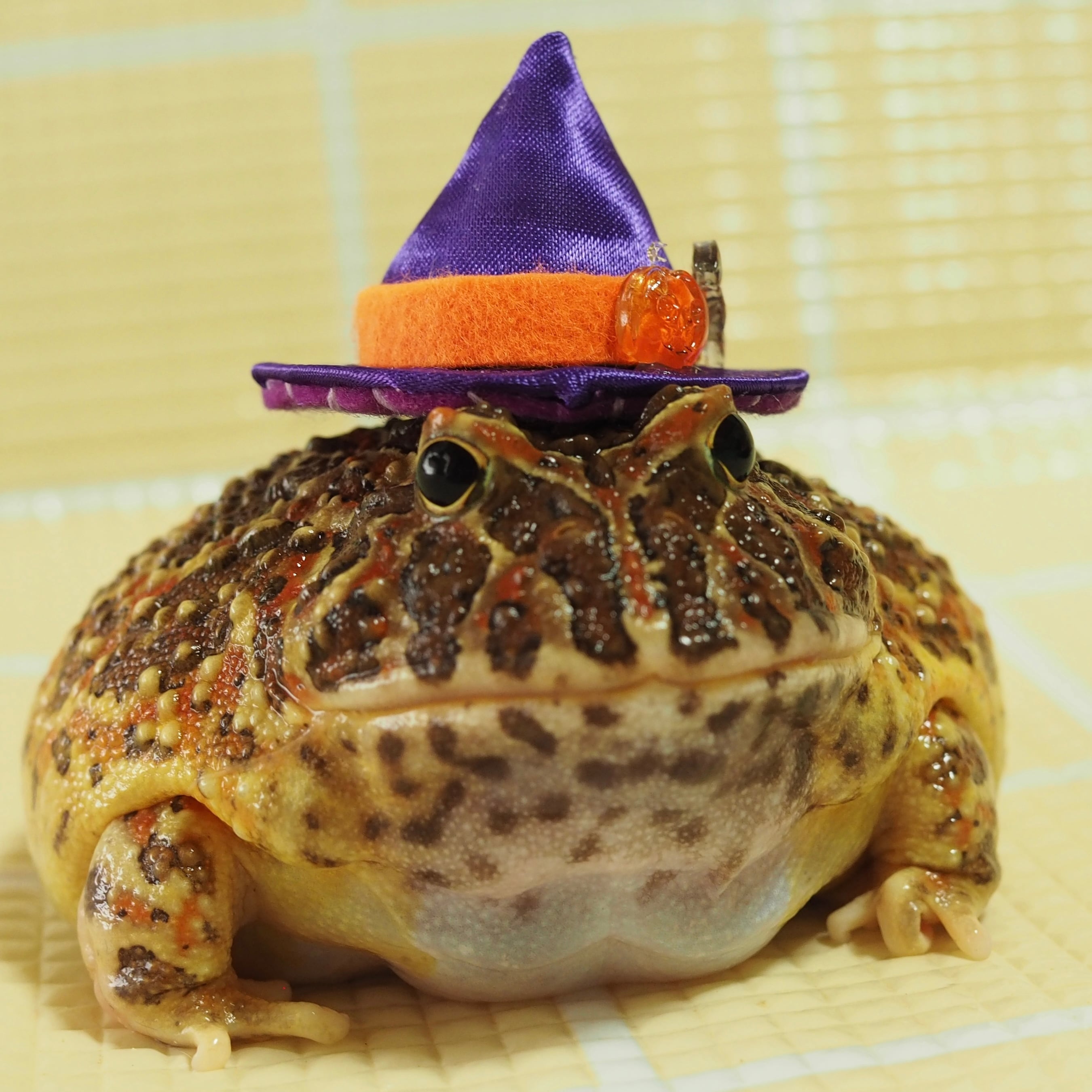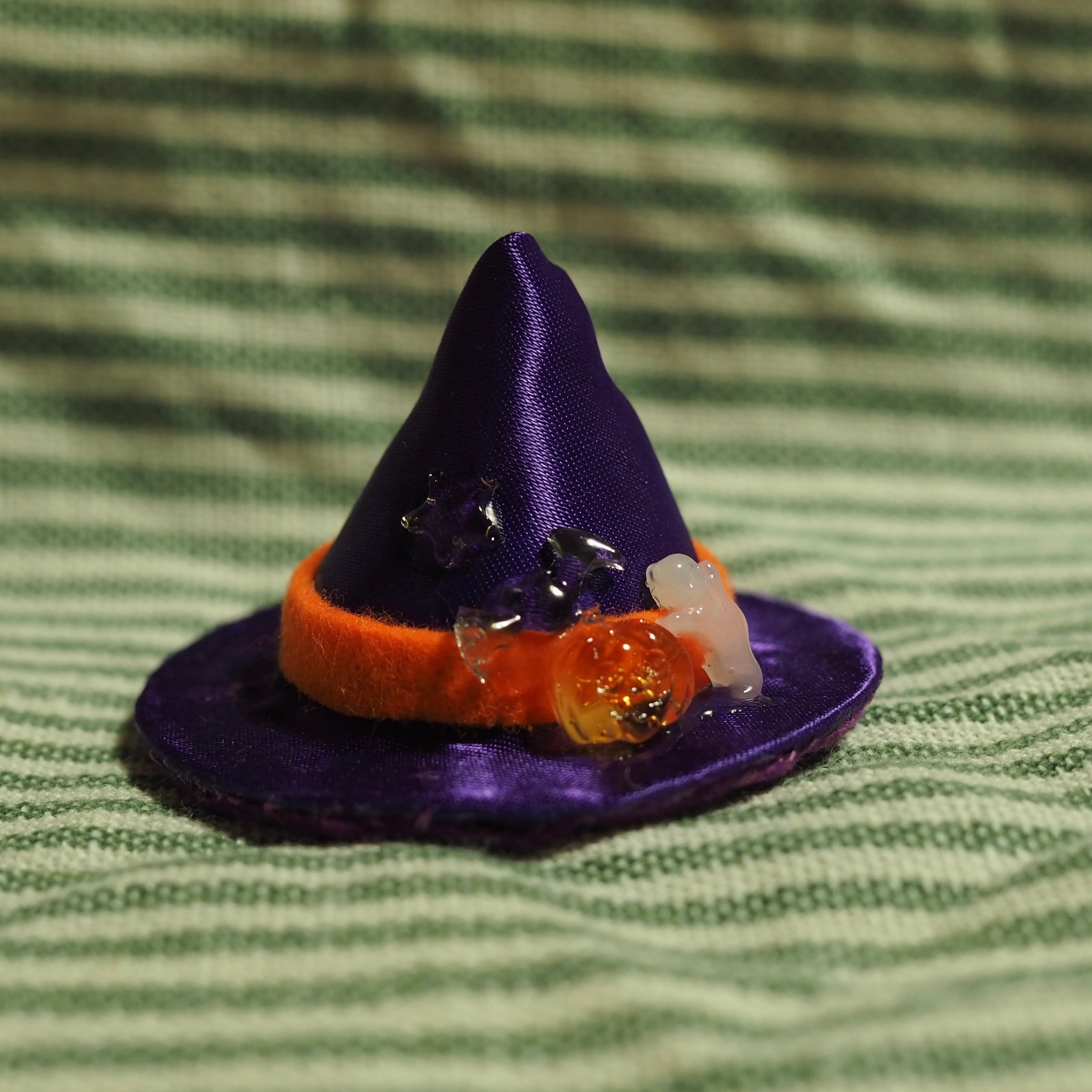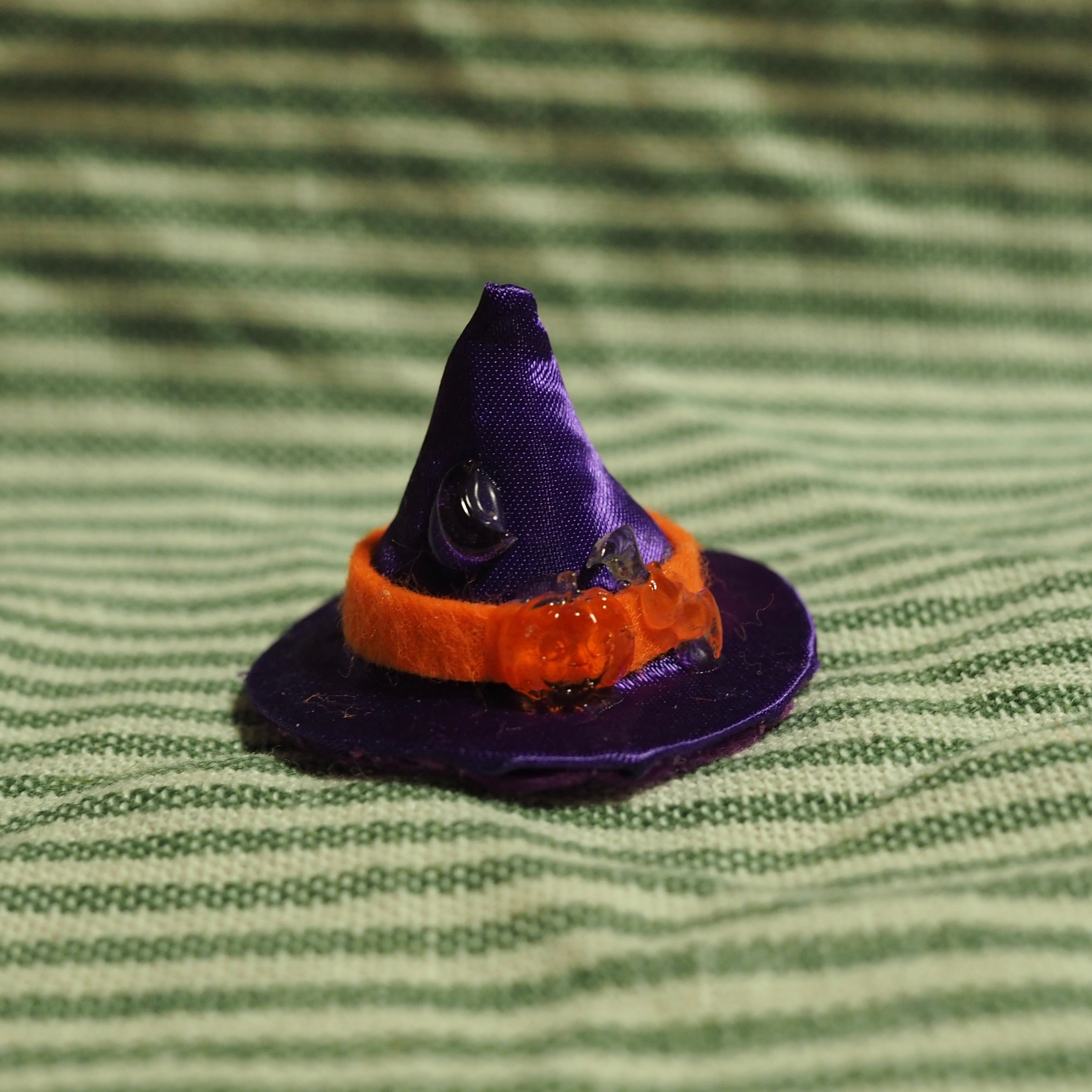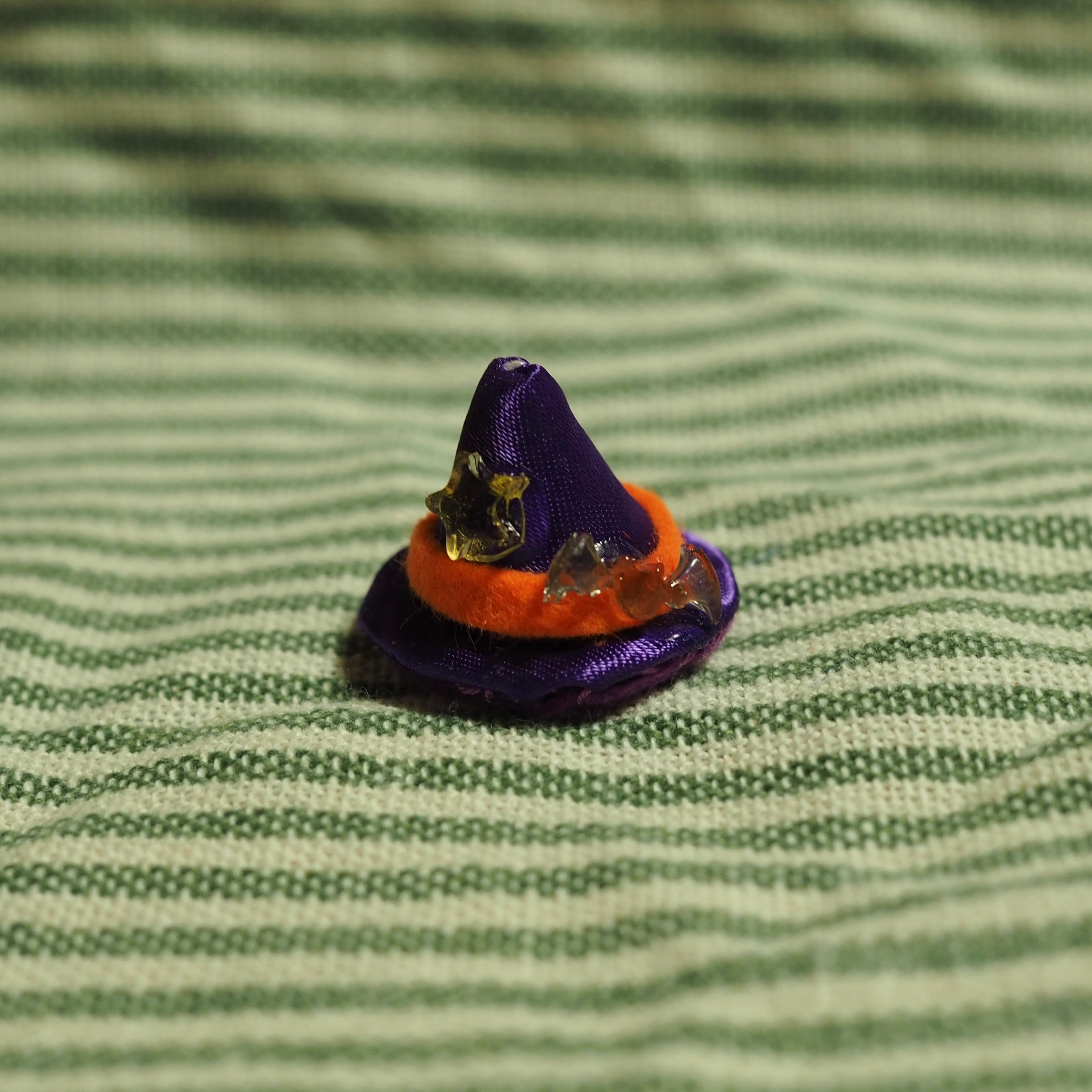 飾って良し、小動物に乗せて良しのかわいい布とフェルトでできたミニチュアサイズの魔女の帽子です。