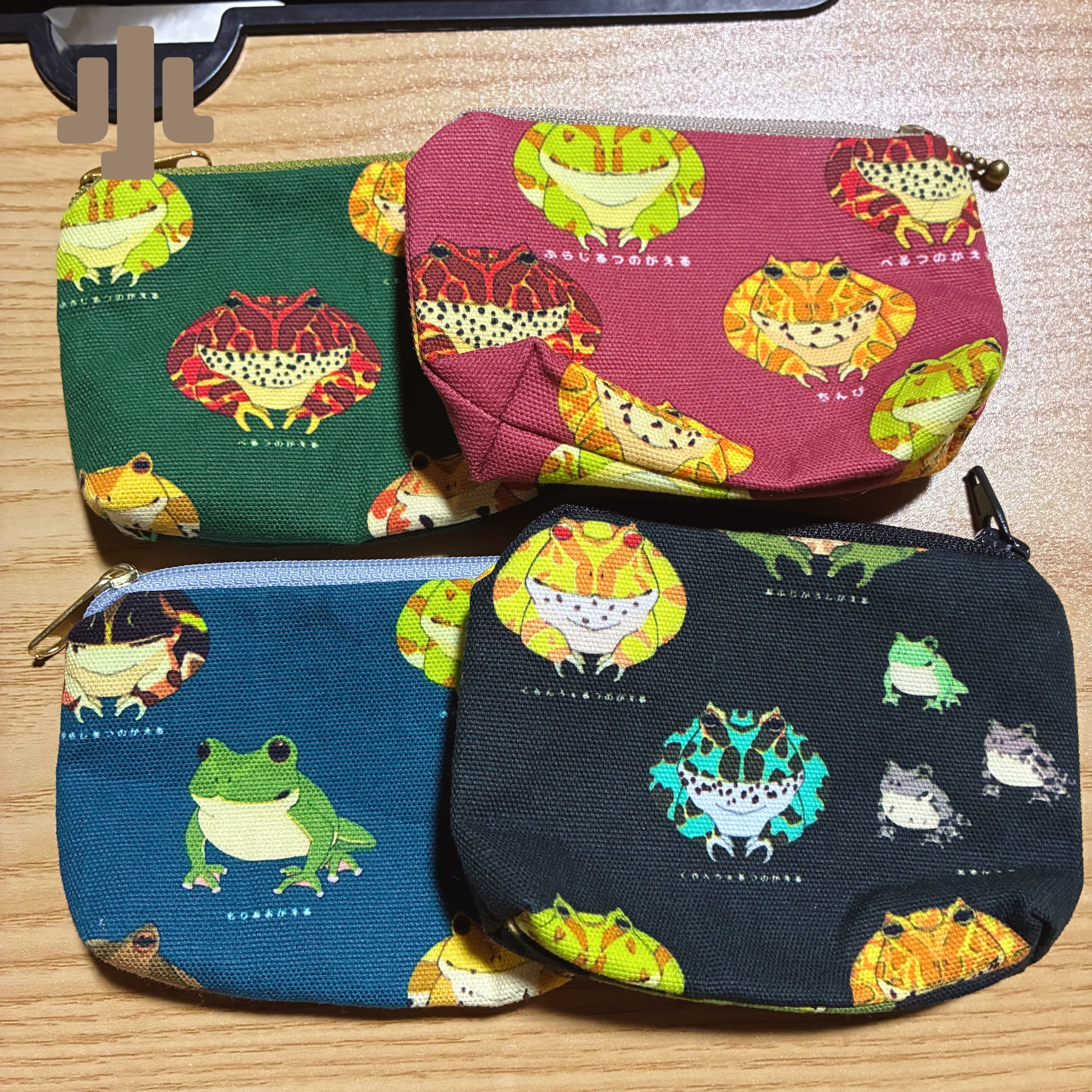 いろんなカエルが描かれたオリジナルの布地のカエルポーチです。